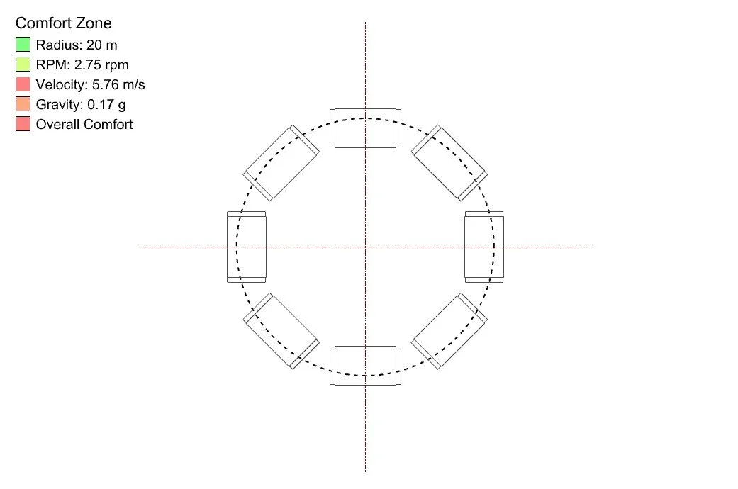 SpinCalc is an artificial gravity comfort calculator developed by Ted Hall. This plugin for Rhino/Grasshopper helps visualize the results with a diagram and dashboard given two simple inputs.